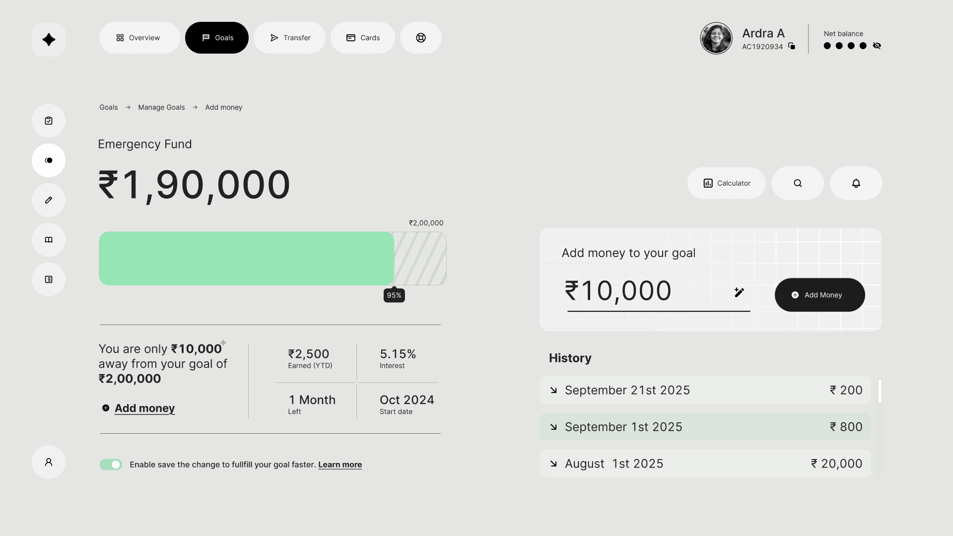 Soft visuals and gentle animations that make saving feel lighter and emotionally easier.